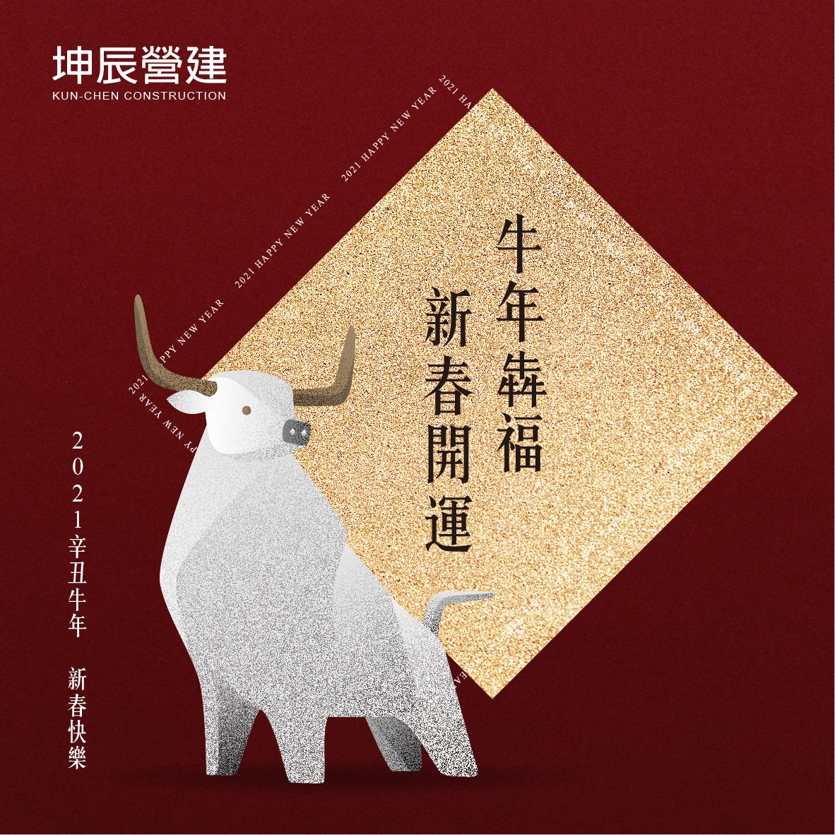 ╱ 歲次辛丑。牛勢大吉 ╱萬象犇新牛年犇福春暖花開新春開運爆竹聲中一歲除,春風送暖入屠蘇。新的一年邁向新的里程碑一起迎接更美好的生活───坤辰營建───您 闔家健康平安、圓滿富貴!牛運當頭、大吉大利春節休假公告除夕2/11(四)~初二2/13(六)初三開市大吉2/14(日)金牛好年走春賞好屋!