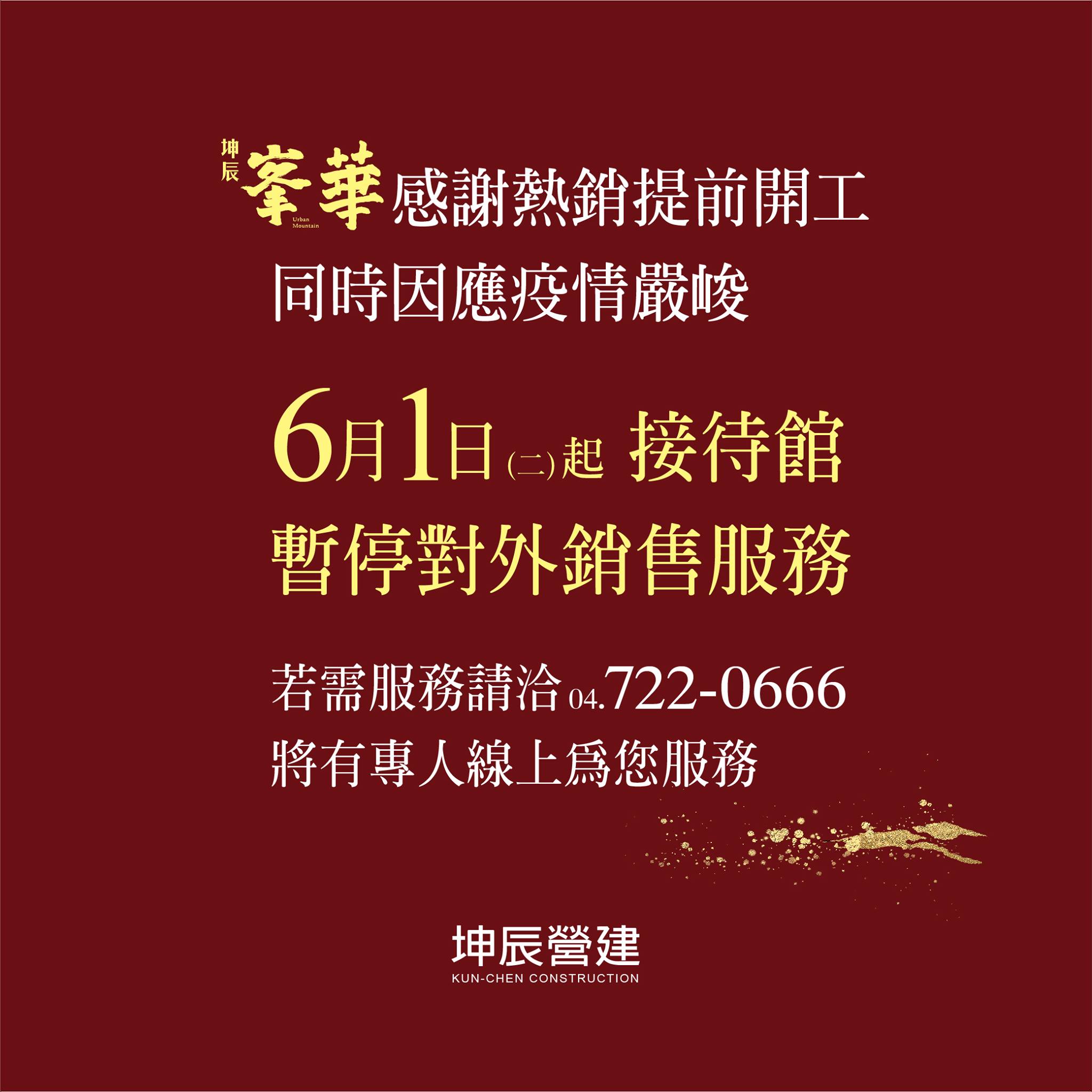 【坤辰峯華】感動熱銷 提前動工因應疫情,接待會館6/1起暫停對外銷售若有購屋賞屋需求的貴賓歡迎來電:04-7220666將有專人線上與您聯繫服務讓我們 同島一心 將心比心_挺過疫情!熱銷開工好宅進行式;坤辰營建團隊繼續專注本業,讓團聚的時刻,家永遠都在。