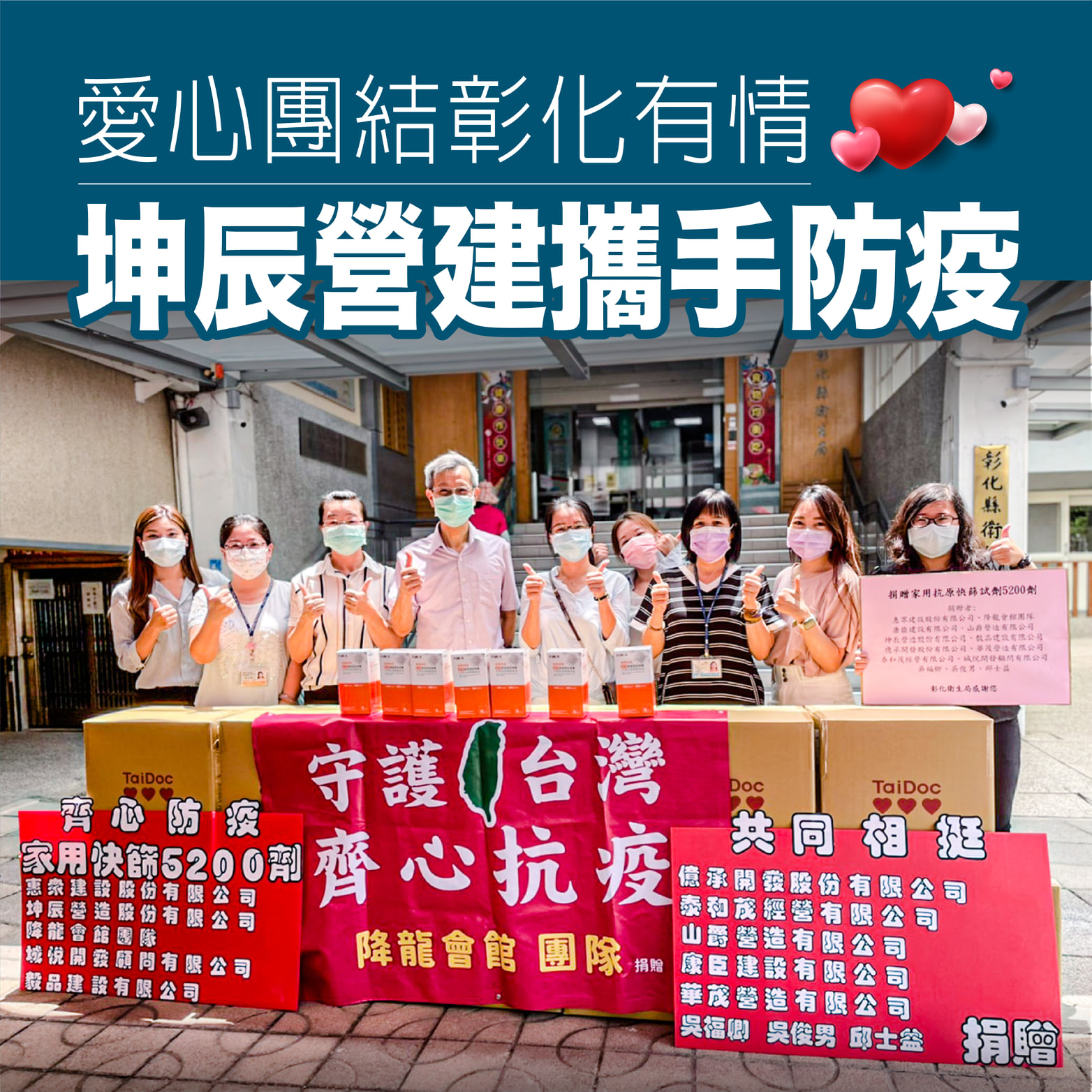 即便疫情微解封防疫日常還是不能鬆懈 攜手企業好朋友們共同發起守護台灣齊心抗疫 關懷活動>>>坤辰營建將家用抗原快篩試劑1000劑贈與 彰化縣政府衛生局企業防疫先鋒隊協助守護更多縣民朋友的健康 身在同島我們都是彼此的夥伴和家人彰化是我們的家防疫路上我們愛心不缺席